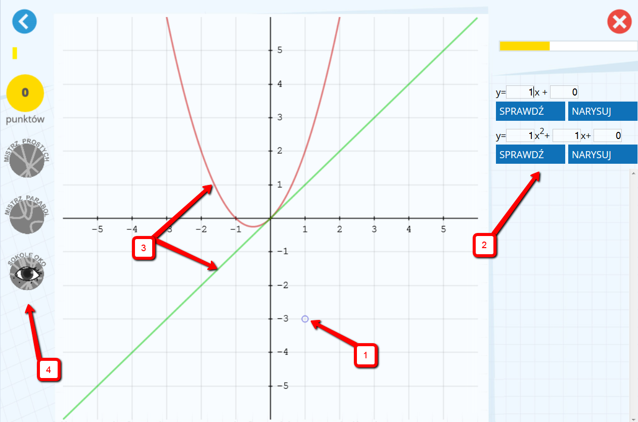 Za przeprowadzenie wykresu przez wyświetlony punkt otrzymujesz 1 punkt. Jeżeli wykres funkcji przechodzi przez dwa punkty – punkty liczą się podwójnie, jeśli przez trzy – potrójnie. Jeżeli udało Ci się przeprowadzić wykres przez zadany punkt bez wcześniejszego sprawdzania, otrzymujesz podwójną liczbę punktów. Jeżeli na danym etapie nie wprowadzisz żadnej funkcji, której wykres nie przechodziłby przez co najmniej jeden punkt, dostajesz dodatkową premię w wysokości 50% zdobytych punktów.